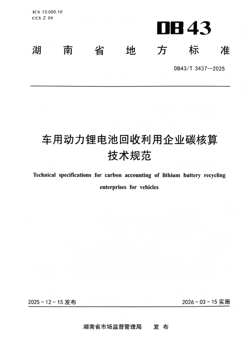 近日,由资环电池旗下中资环电池再生材料(湖南)有限公司(原湖南锂汇通新能源科技有限责任公司)牵头起草的《车用动力锂电池回收利用企业碳核算技术规范》湖南省地方标准正式发布,将于2026年3月15日起实施。