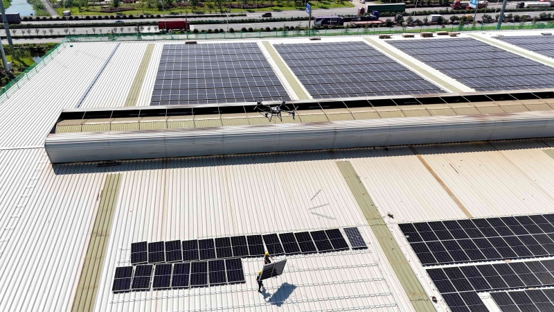 清洁电力的引入,不仅能有效降低企业用电成本,更将助力企业实现能源结构优化升级。传统人工安装单块光伏板需多人协作,功效较低,而无人机凭借搭载的北斗导航定位系统与AI视觉识别技术,实现了组件的自动化精准定位安装。新技术应用后,剩余工程预计5日内即可安装完毕,较原计划提前7天,大大提升了建设效率。