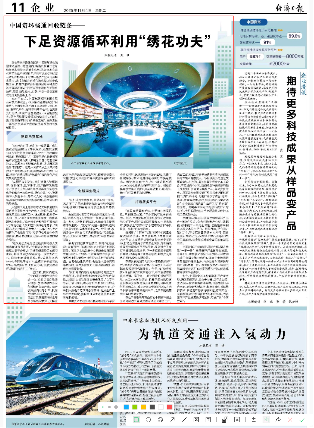 如今,中国资环正加快循环利用产业布局,既紧盯废钢铁、废电子电器、废有色金属、废纺织品、废塑料等传统领域,也瞄准废旧动力电池、退役新能源器件、报废机动车拆解等新领域,推动废旧物资精细管理、有效回收、高效利用,着力畅通资源循环利用链条,为资源循环产业发展提供可复制、可推广的“中国方案”。