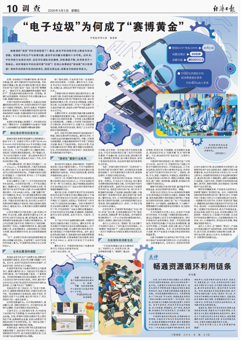 抽屉里的“退役”手机突然值钱了?最近,废旧手机回收价格上涨成为热点话题。我国是手机生产与消费大国,废旧手机存量与增量均十分可观。近年来,手机回收行业逐步向好,但还存在隐私安全隐患、回收渠道不畅、标准体系不一等痛点。如何帮废旧手机找到可靠“归宿”?怎样让消费者在“断舍离”时少些顾虑?推动手机回收市场迈向标准化、规范化新生态,还需多方持续协同发力。